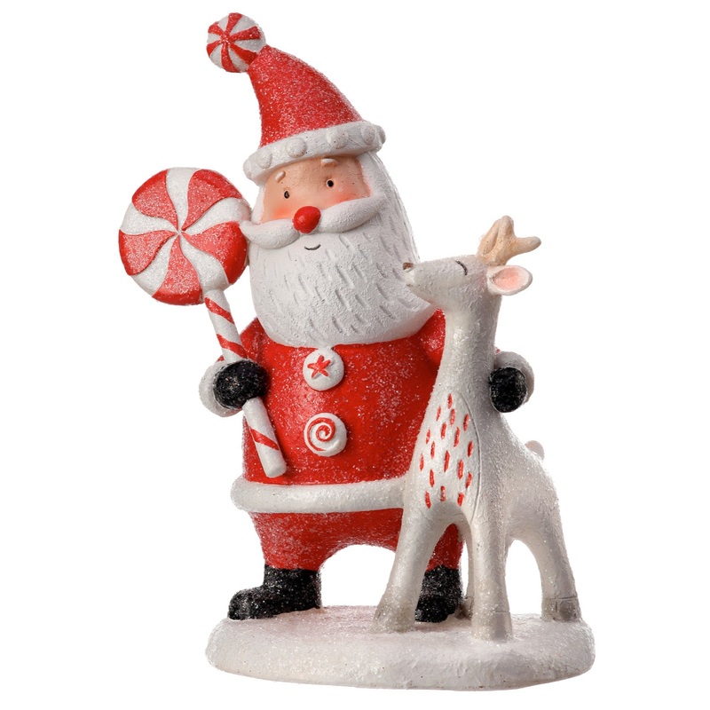 The "Peppermint Santa W/ Lollipop Figurine, 7"" showcases Santa holding a festive peppermint lollipop, accompanied by a charming reindeer. This whimsical decoration adds a sweet and playful touch to your holiday display.