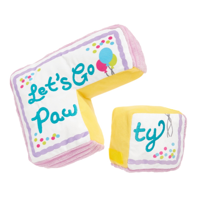 We think your dog takes the cakeespecially that piece in the corner, which detaches as a second toy! Weve sprinkled surprises in this sheet cake dog toy, like two squeakers, crazy crinkle, and shreddable fluff. No matter what piece your dog takes, every bi