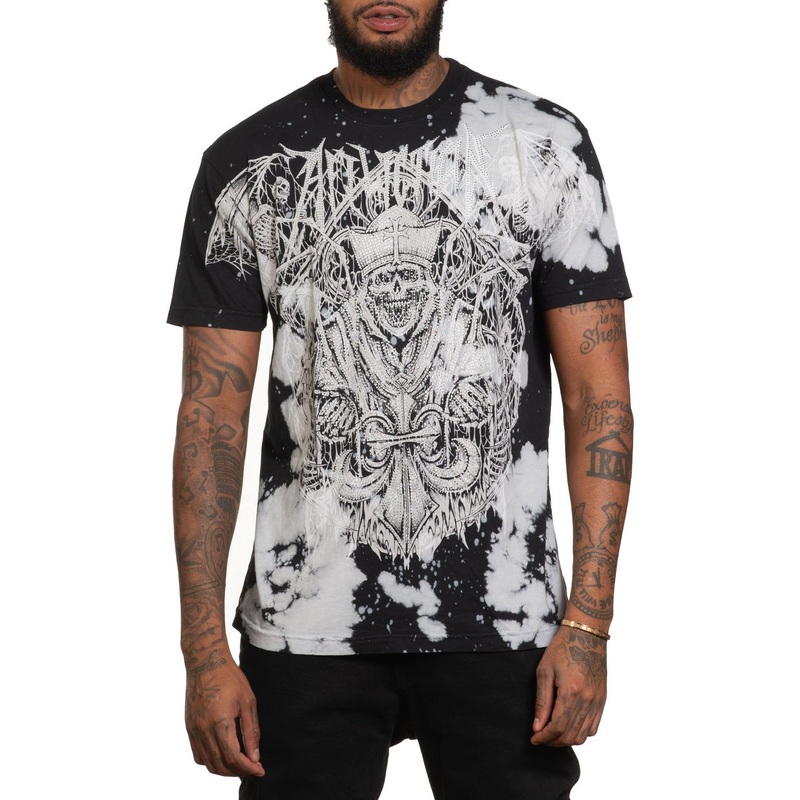 Affliction Men's Pinnacle Dust Crew Neck100% CottonBlack Bleach WashHeavy Clear Rhinestones Over Front ArtModel is wearing size Large