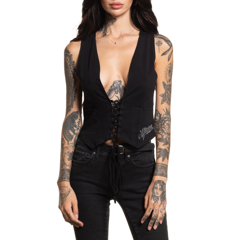 Affliction Womens Queen Of Spades Fitted Vest96% Cotton / 4% SpandexSelf Loops at Center FrontSelf Spaghetti Flat Cord Laced Through LoopsTie at BottomHeavy Soft wash after screen printAffliction Logo Screen Print on Wearers Left SideSilver foilModel is we