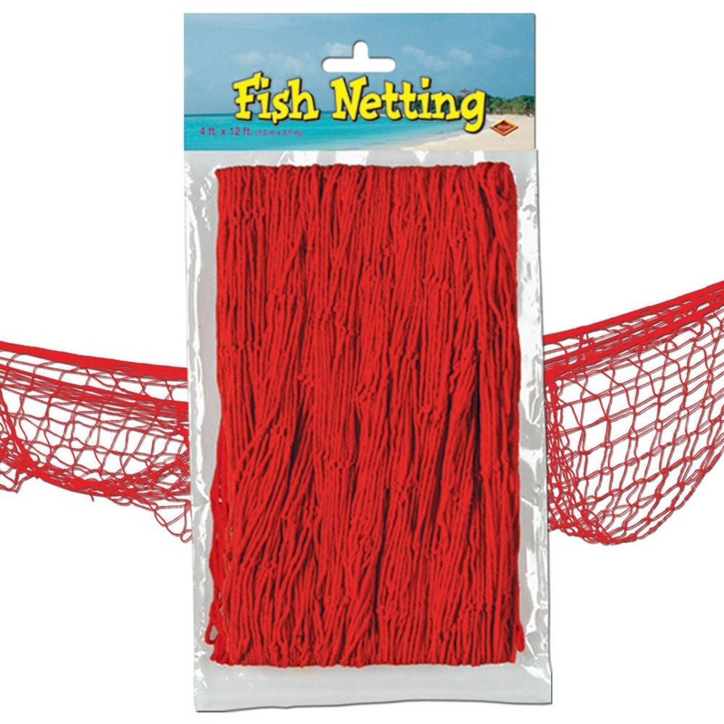 The Red Cotton Fish Net is 4' x 12'. This decoration is a fun for luaus, birthdays, pool parties, and more. This looks great on walls, indoors and outdoors. Put plastic fish in it for a great ocean feel. Another fun thing to do with this, is use to to hold