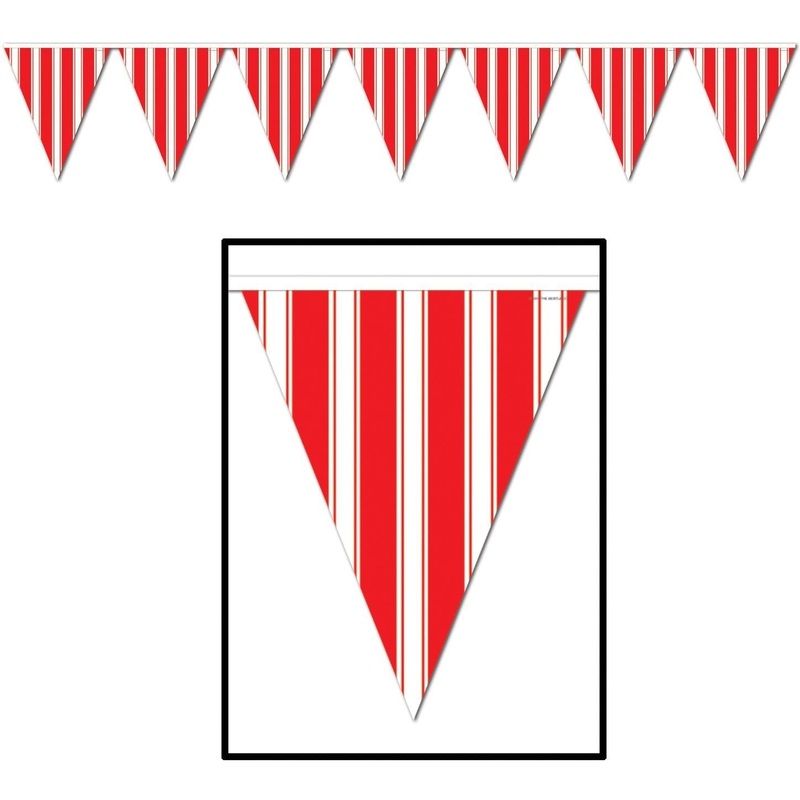 Add a little striped action the party with this Red Striped Pennant Banner. Each banner comes with 12 10'' pennants. Fully displayed the banner is 12' long. Perfect for a circus, carnival, or pirate themed party.