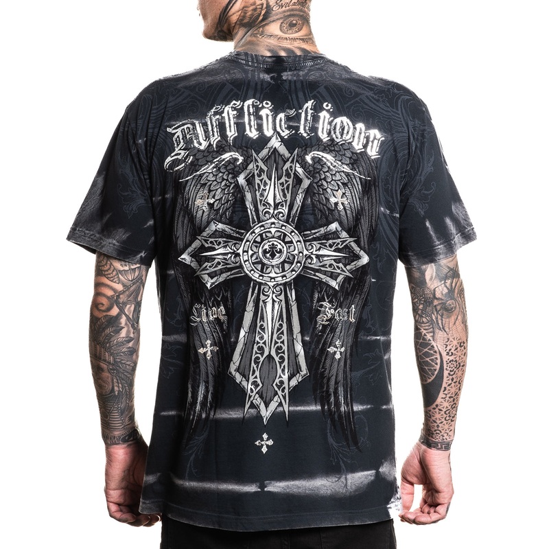 Registered Crew Neck Short Sleeve Tee100% CottonBlack Blind WashEnzyme Silicone Wash After Belt PrintSilver Foil Over Puff InkModel is wearing size Large