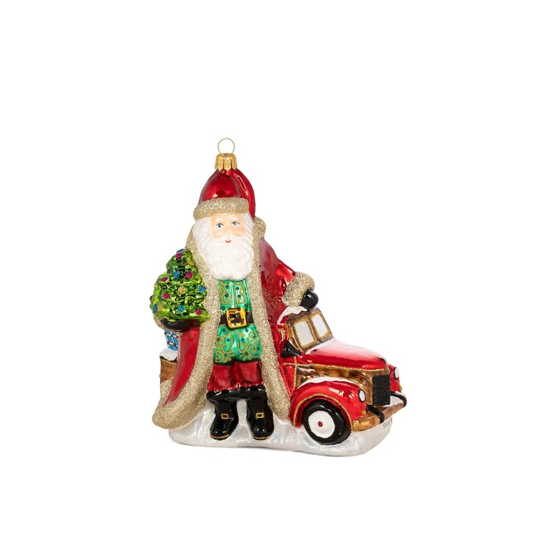 The Santa's Christmas Delivery Ornament is a beautifully hand-crafted piece from a family-owned factory in Poland. Each glass ornament is individually mouth-blown, silvered, and hand-painted using traditional 1800s techniques, ensuring a unique and timeles