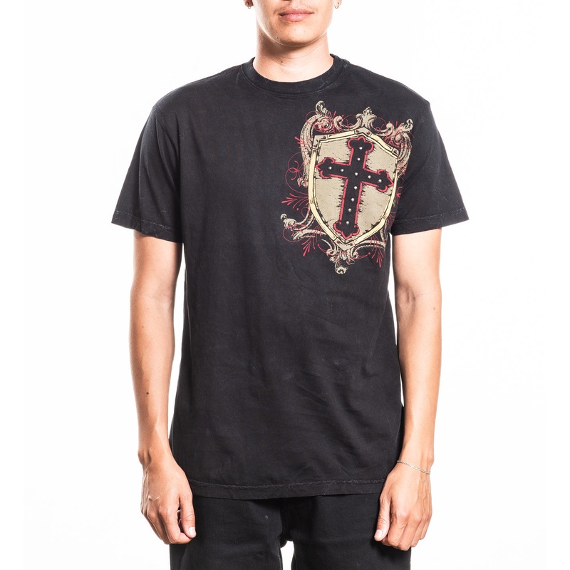 Shielded Short Sleeve Tee100% CottonHeavy Enzyme Silicone WashPatch + Stud Detail on Front + BackModel is wearing size Large