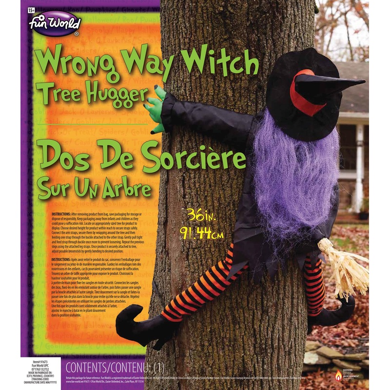 Le corps de la sorcire avec des sangles attaches sur ses bras et ses jambes s’accroche parfaitement aux arbres! De superbes dtails avec de longs cheveux filandreux, des ongles peints et des bas rays festifs.