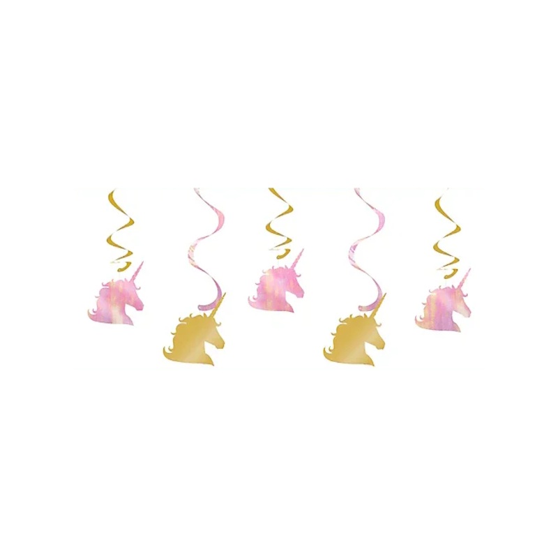 Make your Princess' birthday a fairy tale with these unicorn foil dizzy danglers. It comes with 5 danglers with a unicorn on the end of each one.5 count3 danglers: 30"2 danglers: 39"