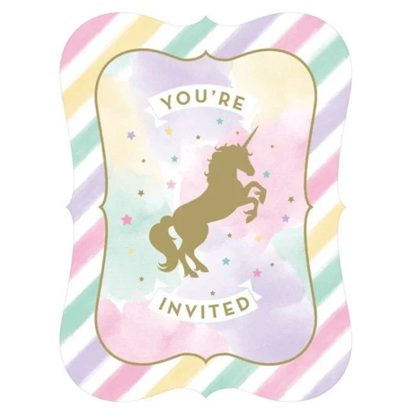 Set the tone with the use of these Sparkle Unicorn Invitations. "Your Invited" written in an elegant gold color is featured next to a magical gold unicorn with a tie dye sparkled background. These party items are made with premium strength paper!
