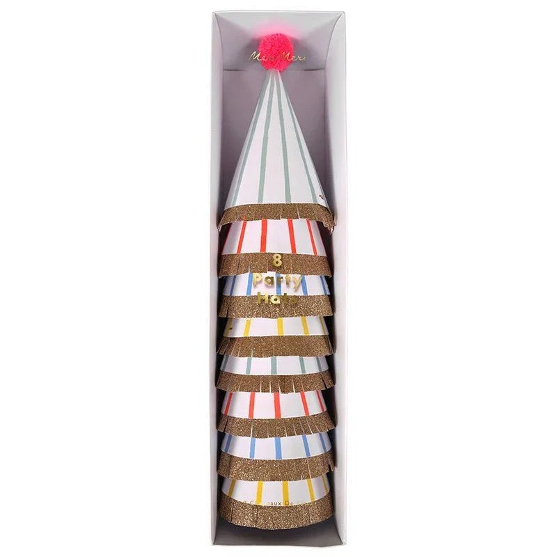 This set of gold-glitter dipped mini party hats will do the trick at any birthday party. Each pack includes 8 party hats in 4 striped colors measuring in at 6 inches with a colorful pom pom on top. Great for wearing or as place markers.