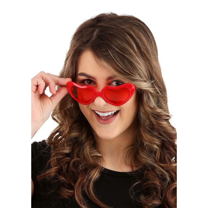 Red plastic heart shaped glasses with red tinted lenses. For novelty use only.