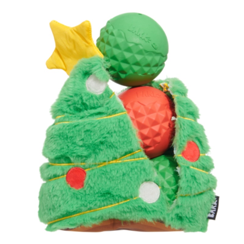 Have you ever seen a Christmas tree dog toy that looked more fetching? Your pup can trim this tannenbomb to find 4 squeaky, natural rubber balls beneath the fabric layer.Small Size: Tree: 5.25" L x 5.25" W x 6.50" HComet Balls: 2.5D x 2.5W x 2.5HMedium/ La