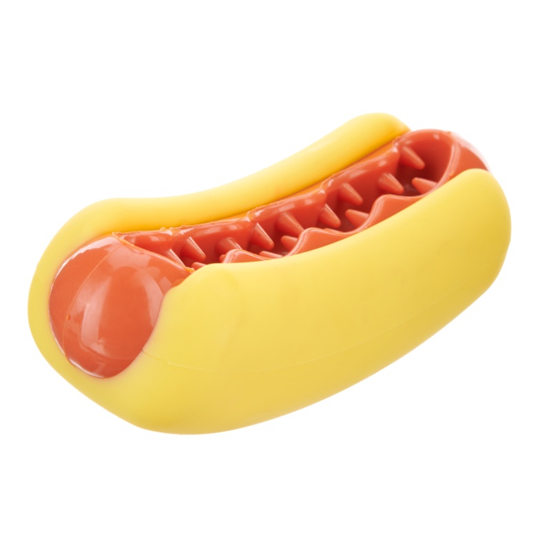 This hot dog dog toy will be your hot dogs hottest hot dog dog toy. To be frank, you can spread treats on this bite-mark resistant rubber frank. Plus, the toy helps clean your dogs teeth, which is probably not true of real hot dogs. This wiener is great fo